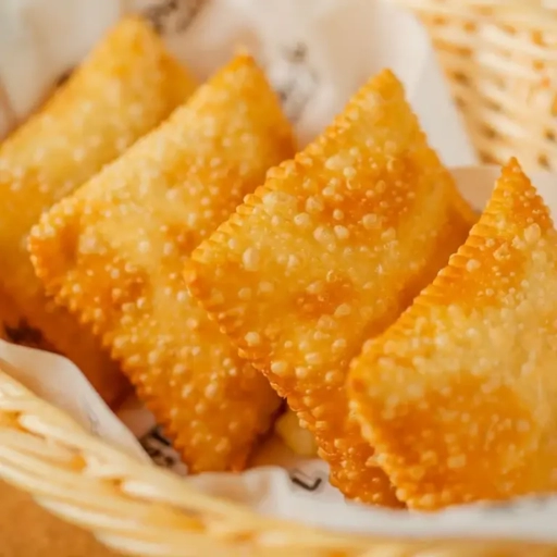 Um cesto com 6 mine pastéis que combinam com o bom e velho caldo de cana pra juntar a galera